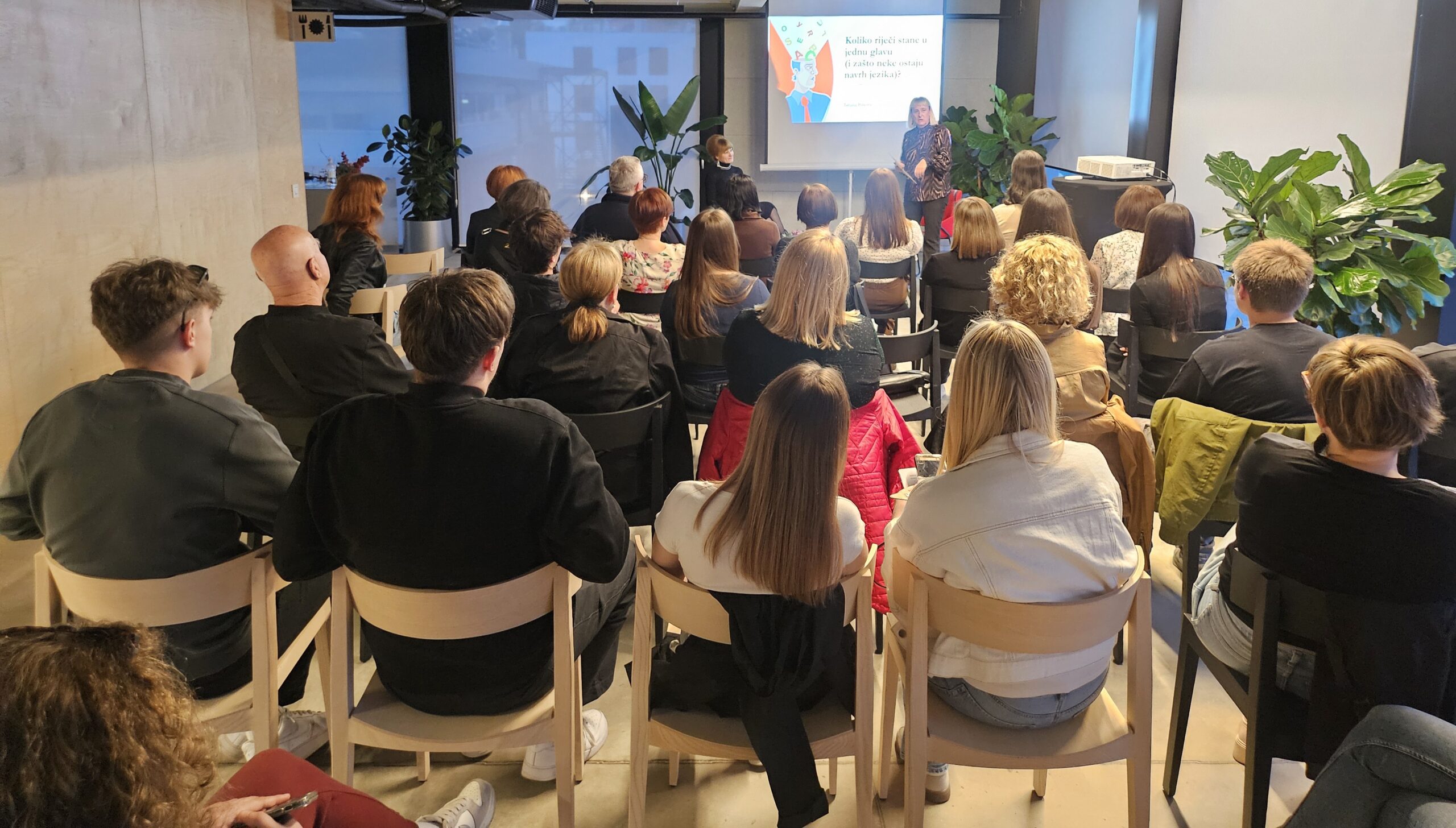 Predstavljanje knjige proteklo je u opuštenoj  i toploj atmosferi u svojevrsnom razgovoru s publikom što je bilo najizraženije u završnom dijelu izlaganje o značenjskim suprotnostima (antonimima) pitanjem publici zašto je slatko suprotno slanom, a ne ljutom ili kiselom. Složenu temu autorica je približila publici svakodnevnim i duhovitim primjerima kojima je potaknula prisutne na dublje promišljanje o jeziku što se očitovala i u postavljenim pitanjima autorici na kraju predavanja. Puno pitanja i tema ostalo je otvoreno za neko sljedeće gostovanje.